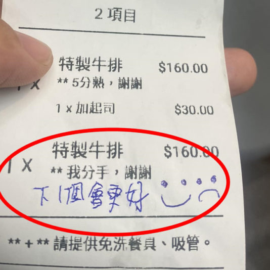 日前一名網友點外送牛排,她本想在備註欄寫「5分熟,謝謝」,沒想到因為注音打字又選字錯誤,打成了「我分手,謝謝」。店家看到後在單子上寫「下一個會更好」安慰她,讓她大傻眼。網友們看到這件事後笑翻:「這個該死的自動選字!」...