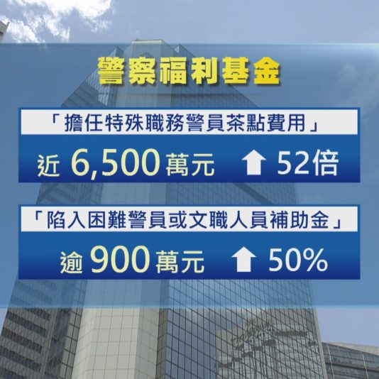 警察福利基金在過去一個年度接收約1億8千萬元捐款,按年升超過26倍,為特殊職務警員購買茶點花費近6500萬元,增加52倍。 警察福利基金向立法會提交文件,顯示在剛過去一個年度,即去年4月至今年3月底,一般儲備金帳目總收入由不足2千萬元,急增至近1億8900萬元,當中大部分為捐款,即大約1億8千萬元,增加超過26倍。...