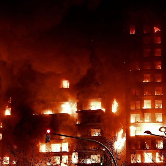 西班牙瓦倫西亞22日一棟14層公寓高樓發生大火,火勢在10分鐘內迅速延燒並蔓延至鄰近建築物,造成4人死亡、13人受傷,部分民眾受困陽台等待救援,熊熊烈焰燃燒的火海景象看起來相當駭人。 ▲公寓大樓全面燃燒,多人受困。(圖/CFP)...